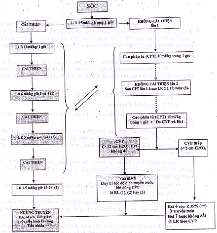 (Ringer lactat hoặc NaCl 0,9% 6-7 ml/kg cân nặng/giờ, truyền trong 1-3 giờ)