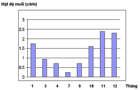 Mật độ Ae. aegypti trong các tháng điều tra thấy sốt xuất huyết Dengue ở Quy Nhơn có đỉnh cao vào tháng 6-7 và tháng 10 đến tháng 1 năm sau, đỉnh thứ nhất vào mùa nóng không mưa, đỉnh thứ 2 vào mùa mưa; qua biểu đồ theo dõi thấy mật độ Ae. aegypti tăng cao trong các tháng mùa mưa từ tháng 9 đến tháng 12, sau đó giảm dần từ tháng 1 đến tháng 7.