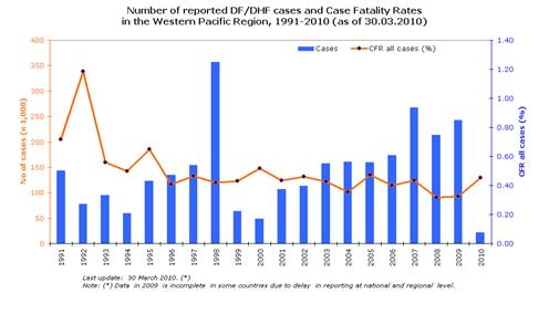 Ở khu vực Tây Thái Bình Dương, từ năm 2001-2008, có tổng cộng 1.020.333 ca mắc được ghi nhận tại Campuchia, Malaysia, Philippines, Việt Nam là những nước có số ca mắc và tỷ lệ tử vong cao nhất (4798 ca tử vong). Năm 2009, có 242.424 ca mắc với 785 tử vong từ 25 quốc gia trong khu vực. Khi phân lập virus đều có mặt cả 4 tuýp. Véc tơ chính là Ae. aegypti, véc tơ phụ là Ae. albopictus. Số ca mắc xảy ra chủ yếu ở các thành phố, thị trấn và các khu vực ven đô thị nơi có mật độ dân số cao. Tuy nhiên, nhiều vụ dịch gần đây ở Campuchia và Việt Nam xảy ra ở cả khu vực nông thôn.