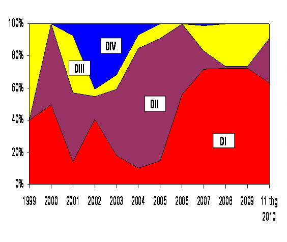 Hình 2. Sự lưu hành các týp virus Dengue tại miền Trung từ năm 1991 - 10/2010 (Bộ Y tế, 2010) |