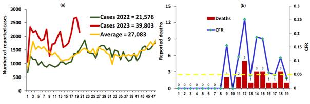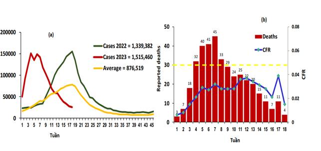 Hình 5. Số ca mắc trong năm 2022, năm 2023 (đến tuần 18) và trung bình 5 năm (a)