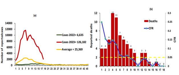 Hình 6. Số ca mắc trong năm 2022, năm 2023 (đến tuần 18) và trung bình 5 năm (a)