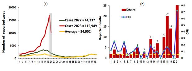 Hình 7. Số ca mắc trong năm 2022, năm 2023 (đến tuần 21) và trung bình 5 năm(a)
