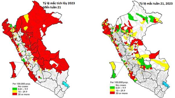 Peru: Cho đến tuần thứ 21 năm 2023, có 115.949 ca SXHD được báo cáo, trong đó có 60.178 (51,9%) ca xác định trong phòng thí nghiệm và 293 (0,25%) được phân loại là ca SXHD nặng. Như vậy, số ca mắc đến tuần thứ 21 năm 2023 cao hơn 161% so với cùng kỳ năm 2022 và cao hơn 365% so với trung bình 5 năm gần đây. Trong giai đoạn này cũng ghi nhận 166 ca tử vong với tỷ lệ tử vong là 0,143%.