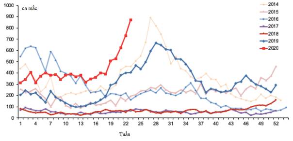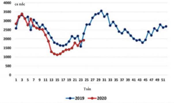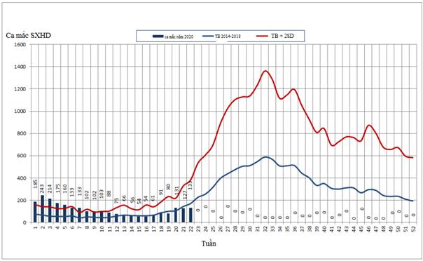Trong tuần thứ 23 năm 2020, Việt Nam ghi nhận 1.144 ca mắc SXHD ở 38 trong số 63 tỉnh/thành và không có ca tử vong, trong số đó có 88% trường hợp nhập viện. So với cùng kỳ năm 2019 (3.536 ca mắc, không có ca tử vong), số ca mắc giảm 3.1 lần (Hình 6). Tổng số ca mắc SXHD từ ngày 01/01/2020 đến ngày 07/6/2020 là 31.966 ca với 03 ca tử vong, thấp hơn so với 71.593 ca mắc và 07 ca tử vong báo cáo trong giai đoạn cùng kỳ năm 2019.