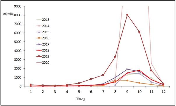 Hình 2. Số ca mắc SXHD ghi nhận hàng tháng giai đoạn 2013-2020, Ủy ban Y tế Quốc gia Trung Quốc.