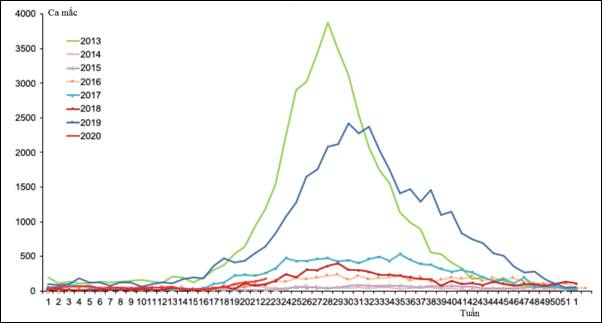 Hình 3. Số ca mắc báo cáo theo tuần giai đoạn 2013-2020, Trung tâm Thí nghiệm và Dịch tễ học