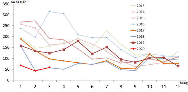 Trong tháng 3/2020, Trung Quốc ghi nhận 16 ca mắc SXHD và không có ca tử vong. Số ca mắc được báo cáo giảm 69% so với cùng kỳ năm 2019. Số ca mắc tích lũy từ tháng 1 đến tháng 3/2020 là 104 ca, giảm 65% so với cùng kỳ năm 2019 (Hình 2).