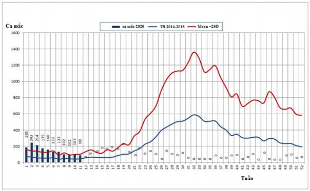 Từ tuần thứ 01 đến tuần 11 năm 2020, Campuchia ghi nhận tổng cộng 1.638 ca mắc sốt xuất huyết Dengue và không có ca tử vong. Số ca mắc SXHD được báo cáo giảm 5 lần so với cùng kỳ năm 2019 (Hình 1).