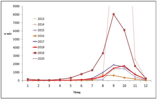 Hình 2. Số ca mắc SXHD hàng tháng giai đoạn 2013-2020, Ủy ban Y tế Quốc gia Trung Quốc.