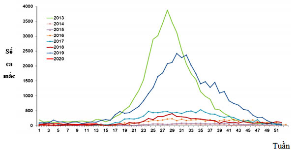 Hình 3. Số ca SXHD ghi nhận hàng tuần giai đoạn 2013-2020, Trung tâm Thí nghiệm và Dịch tễ học