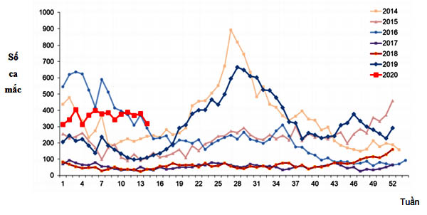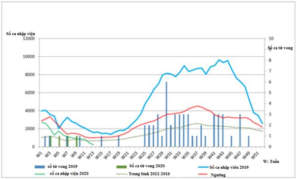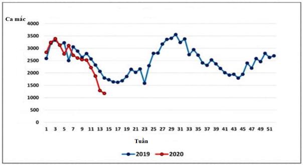 Trong tuần thứ 13, Việt Nam ghi nhận 577 ca mắc SXHD và không có ca tử vong, nâng số ca mắc tích lũy đến ngày 29 tháng 3 năm 2020 là 22.356 ca và 04 ca tử vong do SXHD. Như vậy, số ca mắc giảm 36,3% and giảm 01 ca tử vong so với cùng kỳ năm 2019 (48.701 ca mắc và 05 ca tử vong) (hình 6).