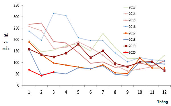 Tính đến 31/3/2020, ghi nhận tổng cộng 170 ca mắc SXHD và như vậy số ca mắc thấp hơn so với giai đoạn cùng kỳ năm 2018 và năm 2019 (hình 7).