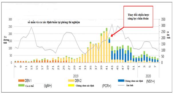 Hình 8. Số mẫu và ca mắc SXHD xác định được báo cáo hàng tuần trong giai đoạn 2019-2020,