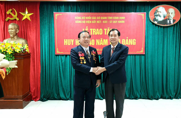 Đầu năm 2022, một vinh dự nữa lại đến với Tôi, tôi đã được nhận: “ Huy hiệu 40 năm tuổi Đảng”. Trong suốt 40 năm qua từ khi được đứng vào hàng ngũ của Đảng, tôi đã không ngừng rèn luyện, không ngừng nâng cao năng lực làm việc, năng lực quản lý với nhiều năm làm Bí thư chi bộ, Bí thư Đảng ủy, Viện trưởng, Phó Viện trưởng, Trưởng khoa, Chủ tịch Công đoàn; xây dựng Viện Sốt rét-KST-CT Quy Nhơn đoàn kết phát triển toàn diện về chuyên môn, phát triển Đảng (từ 5 chi bộ thành 10 chi bộ; từ 70 Đảng viên thành 95 đảng viên); thực hiện công tác đào tạo nguồn lực cho ngành Y tế (Hiệu trưởng Trường trung cấp Xét nghiệm của Viện từ khóa 32 đến khóa 38); tạo điều kiện cho cán bộ học tập nâng cao (06TS; 40ThS, 20 CN); cải thiện đời sống cho cán bộ thu nhập từ 1,6-1,8 lần tiền lương; xây dựng cơ sở vật chất cho Viện khang trang, Xanh, sạch đẹp. Tổ chức nhiều phong trào thi đua cho Công đoàn, Phụ nữ, Đoàn thanh niên về văn nghệ thể thao, Sinh hoạt khoa học, du lịch nghỉ mát trong và ngoài nước; tổ chức nhiều đợt từ thiện,xây dựng nhà tình nghĩa. Đặc biệt xây dựng mối đoàn kết thật sự trong Đảng, trong đơn vị, mở rộng quan hệ hợp tác với nhiều tổ chức và các đơn vị trong và ngoài nước; Quy hoạch đội ngũ cán bộ lâu dài chất lượng; bàn giao cơ sở vật chất và kinh phí đầy đủ cho Viện trưởng mới. Trong thời gian công tác, bản thân và đơn vị được Đảng và Nhà nước trao tặng nhiều Huân chương, bằng khen cho tập thể và cá nhân. Tổ chức Kỷ niệm 40 năm xây dựng và phát triển Viện trang trọng và ấn tượng. Xây dựng cải tạo khu khám bệnh đạt tiêu chuẩn ISO, xây dựng khu nhà khách và Tượng đài Anh hùng Liệt sĩ Đặng Văn Ngữ; bàn giao cho Viện trưởng một Đội ngũ cán bộ hùng hậu có năng lực, trình độ kèm theo kinh phí hàng chục tỷ đồng. Đảng Bộ nhiều năm liền đạt Danh hiệu Trong sạch, vững mạnh.