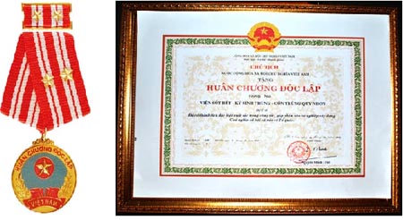 Từ những thành tích đã đạt được qua cả một quá trình phấn đấu vươn lên, phát triển và đổi mới; vinh quang trong dịp Viện long trọng tổ chức kỷ niệm 35 năm ngày thành lập; Viện đã được Chủ tịch Nước Cộng hòa Xã hội Chủ nghĩa Việt Nam tặng thưởng Huân chương Độc lập hạng II, thật vinh quang và tự hào.