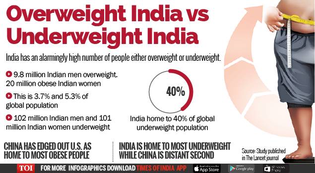 Ấn Độ có tỷ lệ trẻ nhẹ cân trung bình và nặng trong suốt bốn thập kỷ qua (24,4% số bé gái và 39,3% trẻ trai bị nhẹ cân vừa hoặc nặng vào năm 1975, và 22,7% và 30,7% vào năm 2016). 97 triệu trẻ em và thanh thiếu niên nhẹ cân vừa và nặng trên thế giới sống ở Ấn Độ vào năm 2016.