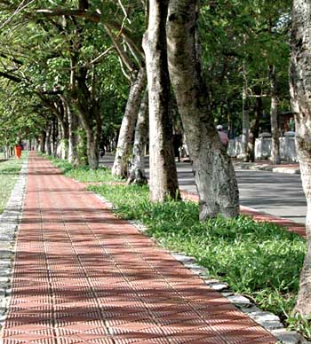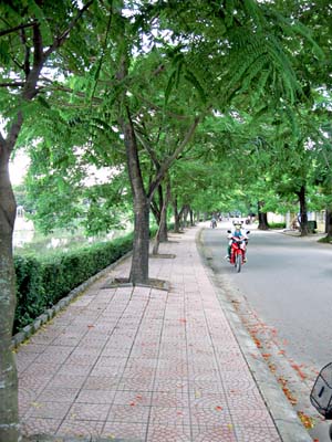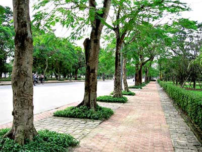 Ngăn cho đến cầu Bạch Hổ chỉ là một con đường hẹp được trồng toàn là phượng. Hồi ấy cũng không có xe lớn, lưu lượng thưa thớt, cho nên phượng mặc sức toả bóng mà không bị chặt tỉa như bây giờ. Đôi hàng cây như tình nhân chụm đầu vào nhau. Một cơn gió thoảng, lá phượng rủ nhau rơi lả tả như mưa, đẹp mê hồn… |