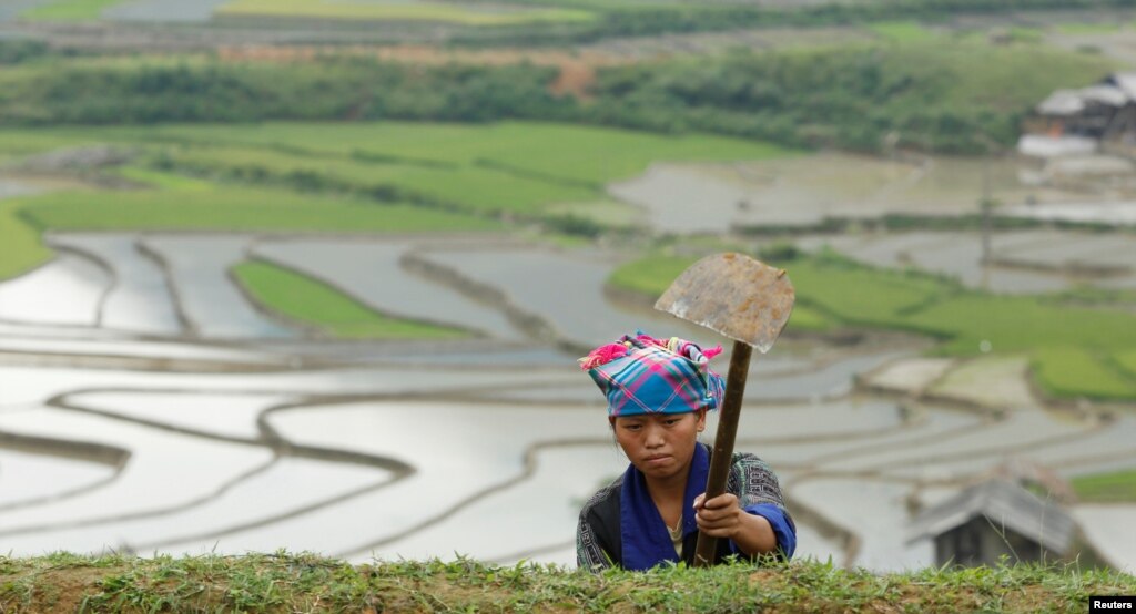 Một nông dân đang làm việc trên một ruộng lúa bậc thang cho mùa lúa mới tại huyện Mù Cang Chải ở phía bắc Việt Nam, cách Thủ đô Hà Nội 360 km, ngày 6/6/2016