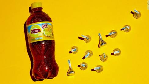 Trà: Lipton Lemon Iced Tea: Có 32g đường trong một chai trà chanh có trọng lượng 500g. Mỗi viên kẹo trong 12 viên kẹo Hershey’s Kisses này chứa gần 2,5g đường.