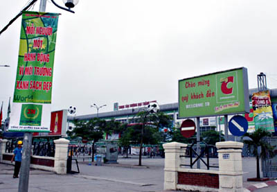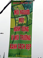 Hơn chục tấm pa nô tuyên truyền cho Ngày Môi trường thế giới treo dọc hai bên đường Trần Duy Hưng, khu vực trước cổng và đối diện siêu thị Big C (Hà Nội) bị sai lỗi chính tả.