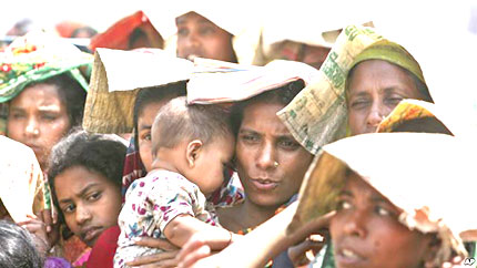| Một phụ nữ Bangladesh che nắng cho con mình khi cô đứng sắp hàng tại một cửa hàng gạo ở Dhaka, ngày 05/4/2008 |