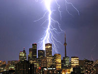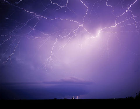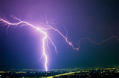 Một tia sét trong cơn bão tại thành phố Budapest, Hungary. | Sét tại thành phố Garden CIty, bang Kansas, Mỹ vào năm 2007. |