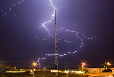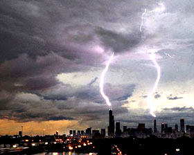 Những tia sét tạo thành mạng lưới chằng chịt trên bầu trời tại thành phố Woodward, bang Oklahoma, Mỹ vào tháng 5/2001. | Sét phóng xuống hai tòa nhà Willis và Trump ở trung tâm thành phố Chicago, bang Illinois, Mỹ. |