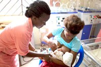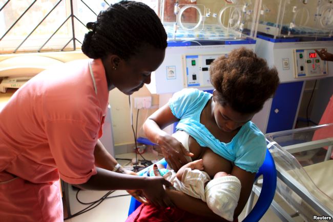 Ảnh- Một y tá giúp đỡ một bà mẹ với một đứa trẻ sinh non đang cho con bú tại trung tâm y tế Kisenyi