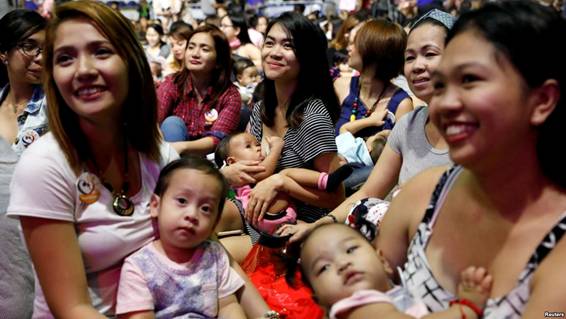 Các bà mẹ Philippines bế con của họ trong một sự kiện cho con bú sữa mẹ đồng thời cùng nhau