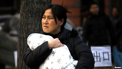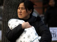 | Một bà mẹ bế đứa con được bọc trong một tấm chăn ở Bắc Kinh |