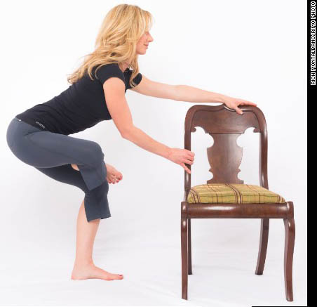 Trụ vững cơ thể bằng cách nắm vào bàn hoặc ghế của bạn, đặt toàn bộ trọng lượng cơ thể lên chân trái của bạn. Đặt chân phải của bạn lên đùi trái phía trên đầu gối trong một vị trí giống số 4. Thở ra khi bạn ngồi xuống sâu hết mức có thể mà không cảm thấy khó chịu, giữ khoảng năm giây, hít thở sâu, lặp lại bên chân phải.