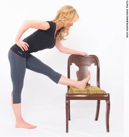 Trong khi giữ ghế hoặc bàn để giữ cân bằn, đặt chân trái của bạn lên ghế hoặc bàn. Nếu cần, hạ thấp chiều cao của ghế xuống một mức an toàn, thoải mái.