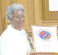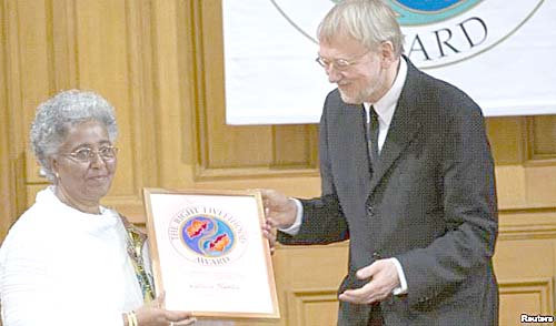 Mafron Ejigayehu (bên trái) nhận giải thưởng Right Livehood được biết đến rộng rãi như là giải Nobel thay thế, thay mặt Catherine Hamlin của Ethiopia, từ người sáng lập ra giải thưởng nhà báo và người chơi tem chuyên nghiệp Jakob von Uexküll tại một buổi lễ |