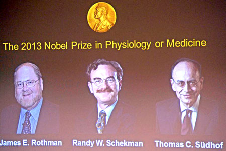 Giải Nobel y học (Nobel Prize for medicine) năm 2013 đã trao chiến thắng cho hai người Mỹ và một người Đức, tất cả đếu làm việc tại các trường đại học của Mỹ.Người Mỹ-James Rothman và Randy Schekman và người Đức Thomas Sudhof đã cùngđược công nhận nghiên cứu về cách thức các tế bào tổ chức hệ thống vận chuyển (research into how the cell organizes) của nó.