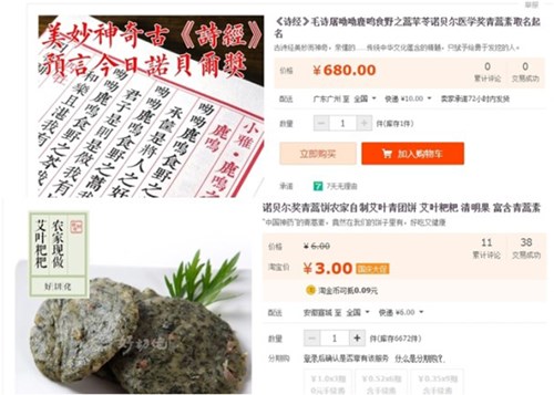 Mạng bán hàng trực tuyến Taobao của Trung Quốc xưa nay có tiếng là “thượng vàng hạ cám, thứ gì cũng bán”, sau khi hay tin bà Youyou Tuđược giải Nobel nhờ chiết xuất ra Artemisinin đã không bỏ qua cơ hội kiếm tiền. Tuần qua, họ đã tung ra hai sản phẩm ăn theo. Thứ nhất là món “Bánh nhà nông Thanh Hao tố đoạt giải Nobel lá Ngải có chứa Artemisinin” với giá 3 tệ/chiếc (10 ngàn VNĐ). Tuy nhiên các chuyên gia y dược khẳng định, trong lá Ngải không chứa Artemisinin, nó chỉ có trong cây Thanh Hao hoa vàng mà thôi.
