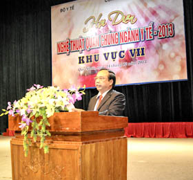 Dược sỹ Nguyễn Văn Quyền, Phó Chủ tịch Công đoàn Y tế Việt Nam phát biểu chỉ đạo hội diễn  |  TS. Nguyễn Văn Chương, Viện trưởng Viện Sốt rét-Ký sinh  trùng-Côn trùng Quy Nhơn, trưởng Ban tổ chức Hội diễn  phát biểu khai mạc Hội diễn  |