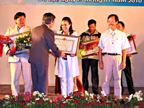 Đại diện các Đoàn nhận bằng khen cho giải xuất sắc nhận (từ trái sang: Đại diện đoàn Viện Sốt rét-Ký sinh trùng-Côn trùng Quy Nhơn; Đại diện Đoàn Sở Y tế Khánh Hòa và đại diện Đoàn Viện Vệ sinh dịch tễ Tây Nguyên) |