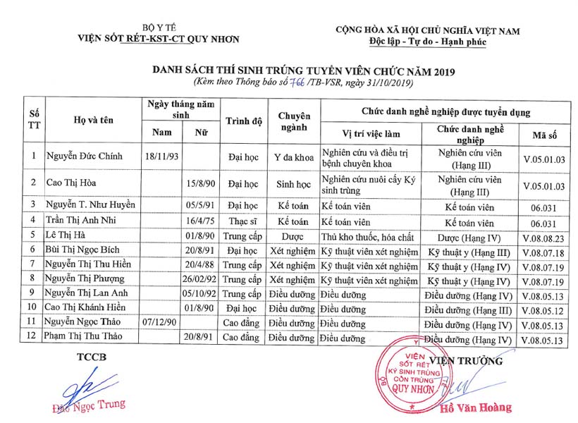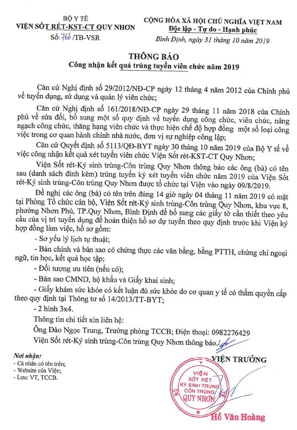 Viện Sốt rét-Ký sinh trùng-Côn trùng Quy Nhơn thông báo các ông (bà) có tên sau (danh sách đính kèm) trúng tuyển kỳ xét tuyển viên chức năm 2019 của Viện Sốt rét-Ký sinh trùng-Côn trùng Quy Nhơn được tổ chức tại Viện vào ngày 09/8/2019.