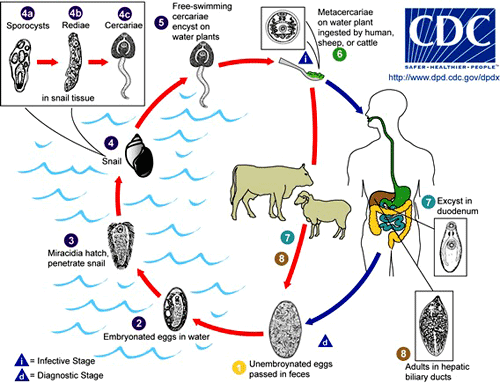 Khi miracidium phát triển đầy đủ sẽ ly giải, giải phóng nắp (operculum) trứng nhờ vào một số men tiêu hủy protease. Giai đoạn hình thành phôi thay đổi từ 27-44 ngày trong điều kiện môi trường tự nhiên. Các miracidia có nhung mao (ciliated miracidia) đẻ vào trong nước và chúng di chuyển tìm đến các vật chủ trung gian thích hợp là các loài ốc nước ngọt thuộc họ ốc Lymnaeidae. Sau khi dính vào các vật chủ ốc thích hợp này, các miracidium đi xuyên vào trong cơ thể ốc, sau đó loại các lớp mao gọi là sporocyst. Các sporocysts được tìm thấy trong chân, trong cơ thể ốc, tuyến tiêu hóa, cơ quan sinh sản và túi thở của ốc. Các sporocysts chứa các tế bào mầm, rồi cho ra 106 rediae mẹ. Các rediae mẹ này giải phóng khỏi sporocyst và di chuyển vào trong các tuyến tiêu hóa, cơ quan thận, cơ quan sinh sản và túi thở của ốc. Mỗi con rediae mẹ có thể sinh ra đến 10 rediae cái. Tuy nhiên, chỉ có 3-6 rediae con có thể hoàn thành chu kỳ phát triển của mình. Ngược lại, mỗi redia con này có thể sinh 1-6 cercariae trong điều kiện thực nghiệm ốc nhiễm và 16-22 cercariae trong điều kiện tự nhiên. Cercariae trưởng thành thường ở trong cơ quan tiêu hóa của các con ốc. Các cercarie trưởng thành này sẽ lồi ra tự phát từ cơ thể ốc và bơi trong nước trong vòng 1-2 giờ trước khi chúng đóng kén trên các loài rau thủy sinh. Sau khi đóng kén sán được gọi là ấu trùng giai đoạn nhiễm hay metacercariae. Phát triển trong cơ thể ốc mất 40-69 ngày tùy thuộc vào nhiệt độ và loài ốc. Các vật chủ chính tiêu hóa các rau thủy sinh chứa metacercariae.