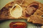 Các lớp vỏ xơ hóa trong nhu mô gan của các laòi hươu hung nhiễm F. magna. Vật chủ chính trước tiên ở thế giới mơi (New World) và một số hươu nai ở thế giới cổ (Old World). Trong các vật chủ chính, các sán đóng vỏ với lớp vỏ xơ mỏng tại các đường mật.Trứng thải vào trong hệ đường mật, rồi vào ruột non và thải ra theo phân của vật chủ. Do vậy, đây là quá trình nhiễm tiềm tàng. Lớp vỏ xơ hóa là quá trình đáp ứng chống lại giữa vật chủ với ký sinh trùng và là động lực sinh bệnh của sự nhiễm ký sinh trùng F. magna. Chúng thường chứa từ 2-5 con sán, dịch màu đen – xám, kèm theo trứng và các tế bào hoại tử hay tế bào mảnh vụn.