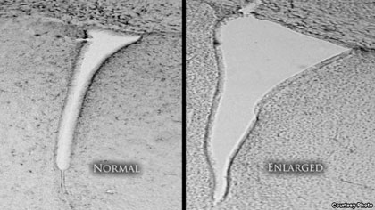 | Một bộ não chuột bị phơi nhiễm với không khí bị ô nhiễm cho thấy một não thất bên bị phình đại (bên phải) so với não bộ ở một con chuột với không khí sạch và được lọc. Não thất bên phình đại có liên quan ở người mắc bệnh tự kỷ và tâm thần phân liệt. |