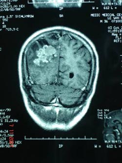 Năm 2004 bệnh nhân bị động kinh, chưa điều trị gì. Từ đó đến nay lên 3 cơn, cơn gần nhất cách đây 1,5 năm. Cách đây khoảng 3 tháng bệnh nhân thấy yếu tay chân bên trái nên đi khám bệnh tại Trung tâm Y Khoa Medic Quận 10, TPHCM phát hiện thấy có thương tổn ở não, qua hình ảnh MRI kết luận: Tổn thương não vùng đỉnh phải. Có hiệu ứng choáng chỗ trên não thất bên bên phải và cấu trúc đường giữa. U não. Chẩn đoán giải phẩu bệnh: di căn não. Tổn thương ở thái dương bên phải sát sọ. Dập não cũ . Không có viêm xoang. Quá phát niêm mạc cuống mũi giữa và dưới 2 bên.Bệnh nhân được giới thiệu đến khám và điều trị bằng dao gamma ở Bệnh viện trường Đại học Y Dược Huế.