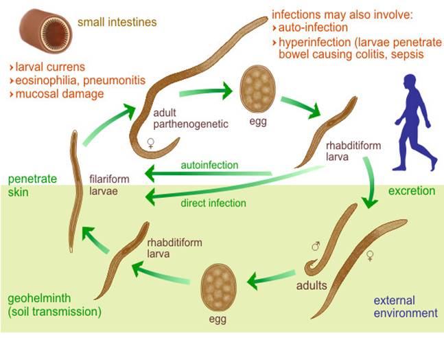 Trong bệnh nhiễm giun lươn đường tiêu hóa, các triệu chứng kinh điển của bệnhchiếm tỷ lệ cao (đau bụng, phân lỏng, sụt cân), các triệu chứng khác như đau đầu, ấu trùng di chuyển dưới da thấp hơn. Ivermectin liều duy nhất cho tỷ lệ chữa khỏi cao và đóng vai trò như thuốc lựa chọn đầu tay với bệnh giun lươn ở người.