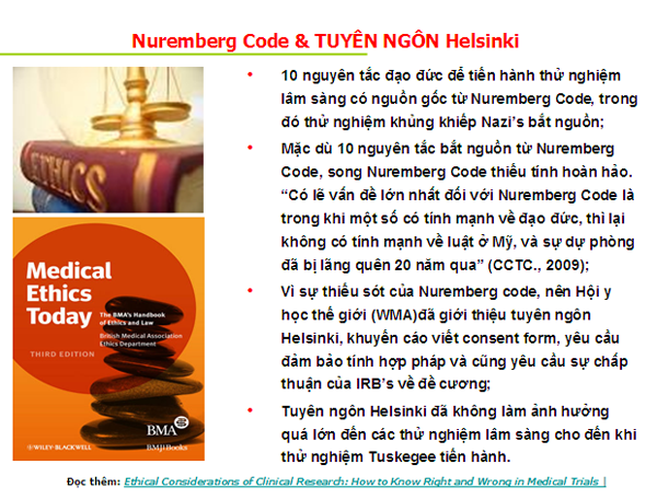 • Vì sự thiếu sót của Nuremberg code, nên Hội y học thế giới (WMA)đã giới thiệu tuyên ngôn Helsinki, khuyến cáo viết consent form, yêu cầu đảm bảo tính hợp pháp và cũng yêu cầu sự chấp thuận của IRB’s về đề cương;