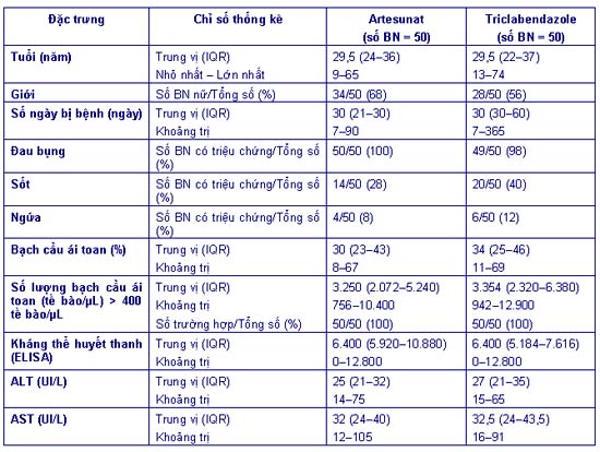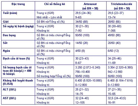 Các đặc trưng ban đầu. Có 50 BN được phân ngẫu nhiên vào nhóm triclabendazole (TBZ) và 50 BN vào nhóm artesunat (ATS). Nói chung, hai nhóm đều tương tự nhau vào lúc đầu (Bảng 2). Tuổi trung vị là 29,5 tuổi và BN nữ nhiều hơn nam (62%). Thời gian bệnh trung vị ở hai nhóm như nhau, nhưng có phân bố rộng hơn ở nhóm triclaben-dazole (khoảng liên tứ phân 7–365 ngày so với 7–90 ngày, TBZ so với ATS); 35% số BN có AST tăng cao lúc đầu và 10% có AST tăng cao (9% tăng cao cả hai enzym). Không có BN nào bị vàng da.