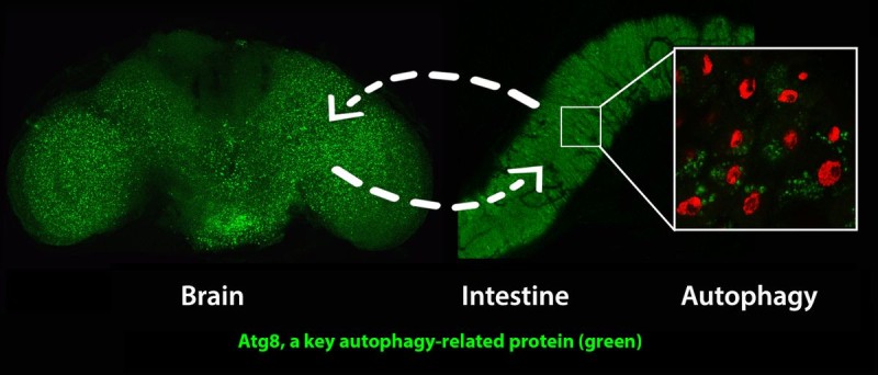 Kích hoạt một gen có tên là AMPK trong hệ thần kinh gây ra quá trình tái chế tế bào của tự thực bào trong cả bộ não và ruột,kích hoạt AMPK trong ruột dẫn đến tăng tự thực bào cả ruột và não. Matthew Ulgherait, David Walker và các đồng nghiệp ở UCLA cho thấy rằng thông tin liên lạc liên cơ quan này trong quá trình lão hóa có thể kéo dài đáng kể tuổi thọ và sự khỏe mạnh của ruồi giấm. Các nhà sinh vật học UCLA đã xác định được một gen có thể làm chậm quá trình lão hóa trong toàn bộ cơ thể khi được kích hoạt từ xa trong các hệ thống cơ quan quan trọng.