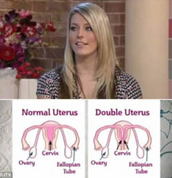 Hazel Jones luôn tự hỏi tại sao cô bị chuột rút nghiêm trọng và thường có kỳ kinh nặng nề trong suốt giai đoạn dậy thì. Tuy nhiên, mãi tới năm 18 tuổi, cô mới đi thăm khám bác sĩ và được chẩn đoán có tới ... 2 âm đạo. Cô gái tóc vàng, 27 tuổi, đến từ High Wycombe, Buckinghamshire (Anh) này mắc một chứng bệnh rất hiếm gặp, với tỷ lệ xuất hiện 1/1 triệu người. Việc mắc hội chứng "tử cung kép" đồng nghĩa Jones có 2 tử cung và 2 cổ tử cung riêng rẽ. Jones chỉ tới khám bác sĩ sau khi người bạn trai lâu năm nói, cô có "điểm lạ" ở vùng sinh dục. Một chuyên gia sản, phụ khoa lý giải: "Khi phát triển trong bào thai, các thai nhi gái bắt đầu với hai đoạn ống tử cung. Tuy nhiên, các vách ngăn sẽ bị phá vỡ và hình thành một tử cung. Cứ khoảng 3.000 ca thì có 1 trường hợp, vách ngăn vẫn còn tồn tại bên trong tử cung, nhưng trường hợp có 2 tử cung riêng rẽ thực sự hiếm xảy ra hơn nhiều".