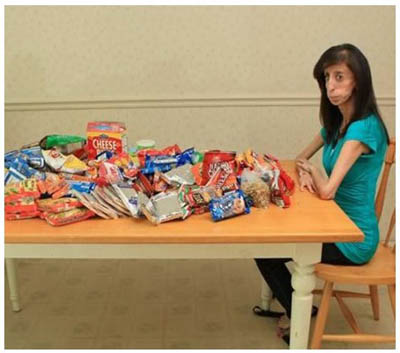 Nếu người một người bình thường chỉ cần ăn một ngày ba bữa thì cô gái 21 tuổi Lizzie Velasquez với hội chứng Neonatal Progeroid lại không thể sống được nếu không ăn ít nhất 60 bữa ăn một ngày. Bạn sẽ tự hỏi tại sao Lizzie lại phải ăn nhiều tới vậy, nguyên nhân sâu xa đến từ việc hội chứng khiến cho Lizzie không thể tăng cân cho dù có ăn nhiều tới mức nào đi chăng nữa. Không chỉ có vậy, các quá trình lão hóa trên cơ thể cô gái cũng diễn biến nhanh hơn một cách bất thường bên cạnh việc chất béo liên tục bị đào thải trên mặt và cơ thể. Cách chống chọi duy nhất mà các bác sĩ có thể dành cho Lizzie lúc này là ăn “càng nhiều càng ít” vì gần như cô không thể hấp thụ dù chỉ là một phần nhỏ lượng thức ăn khổng lồ mỗi ngày.