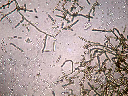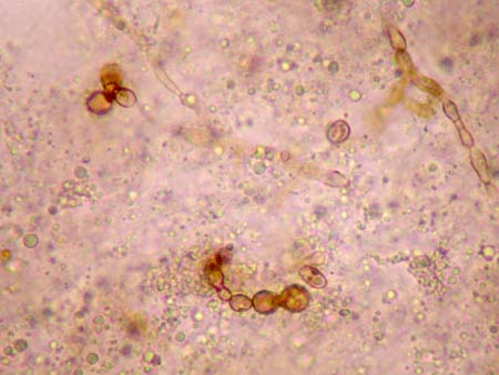 Xét nghiệm nấm tại khoa Ký sinh trùng bao gồm: Nghiền nhỏ bệnh phẩm bằng đũa thuỷ tinh vô khuẩn để nuôi cấy trên môi trường Sabouraud agar có Chloramphenicol ở nhiệt độ phòng và nhiệt độ 37 0 C sau đóxét nghiệm nấm trực tiếp bệnh phẩm với mực tàu và bệnh phẩm ngâm trong dung dịch KOH 30%, kết hợp với nghiền nhỏ bệnh phẩm soi trực tiếp sau khi nhuộm Giemsa. Kết quả xét nghiệm nấm trực tiếp kết luận: Nấm men có sợi giả kết hợp với nấm sợi có vách ngăn có sắc tố màu vàng nâu.(Hình 2).